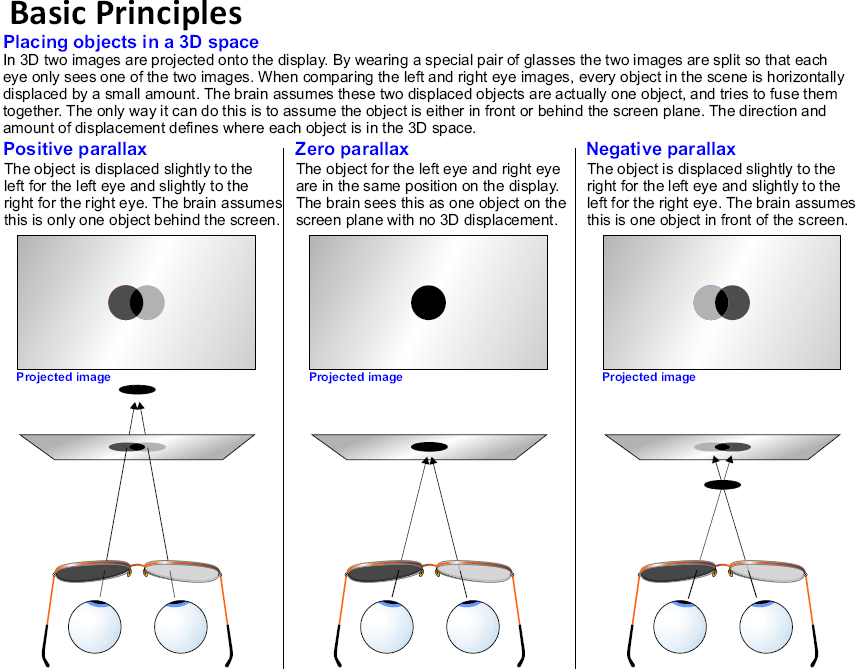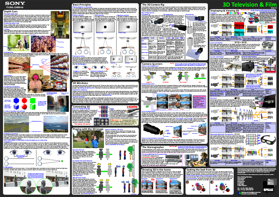 Sony have a great poster we have here for downloading on pdf that explains 3D TV and Film very simply by covering the 3D fundamentals like the Eight Depth Cues, Basic Principles, 3D Rigs, 3D Rig Errors, Placing objects in a 3D space, 3D Blindness, Connecting 3D Output, Playing with the 3D image and How to enhance a 3D shot, The Stereographer, and all the way from double lens to Showing 3D in the home.