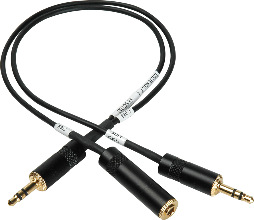 The DSLR-AGCY was developed to enable disabling of the Auto Gain Control in Canon and other HD DSLR cameras. This cable allows you to split your audio tracks. One end of the cable is used to stream a continuous tone from an iPod or other mp3 player to the camera. This fools the camera into lowering the audio gain. The other end of the cable is used to connect a microphone or preamp to the camera. Only one channel is recorded but that is easily resolved in post production by deleting the “tone” channel and duplicating your “good” channel. This provides a solution to the cameras’ lack of manual audio controls.