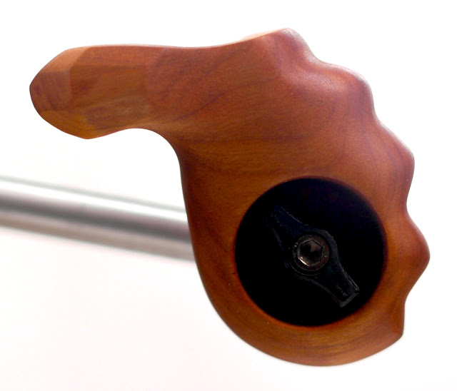 The hand grip is a Aaton style single sided hand relief handle. It comes with a light weight 15mm rod support.
