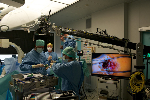 Projected onto a huge 3.5x6m 3D screen, this live surgery again sets the standard for interactive learning. We employ a fully new compact 3D rig in the operating room, completely controllable for interocular distance and convergence, while at the same time being able to zoom in and focus to almost macro mode from a distance of only 1 meter. The two full HD cameras on this rig capture the entire procedure from the surgeon’s view, while two other 3D cameras provide additional images from the OR.