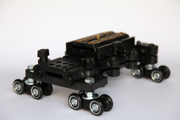 Here we go boys and girls a straight up simple why didn’t I think of that idea and concept put into a product that is ideal for the small camera and DSLR Shooter to have in their filming kit. RigWheels are made up 4 rubberized bearing wheels per carriage. Prices start out at $38 for one RigWheel and $115 for a set of four.