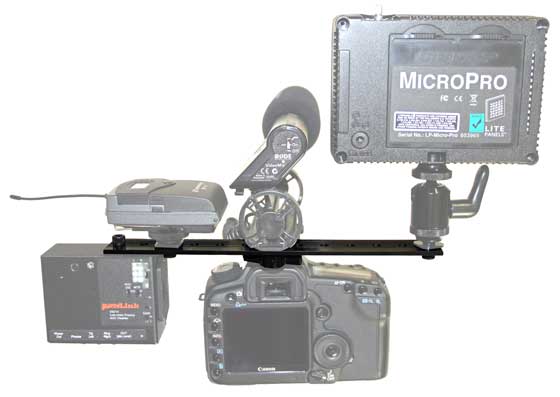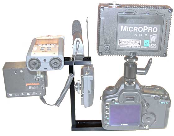 This bracket mounts to the 3/8-16 threaded hole at the bottom rear of the Rode VideoMic, and provides for numerous points for mounting accessories.