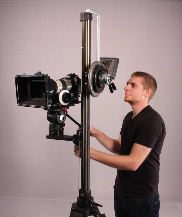 A continuous cable surrounds the track end-to-end, providing control of camera travel up and down the track. Camera packages weighing up to 40 pounds (18.2 kg) can be mounted on Kamtrax. To render the camera weightless, the same amount of weight in barbell disks are attached to the other side of the continuous cable. The camera can then be raised or lowered using the power of a single finger, and the camera can be positioned at any point up or down the track without being locked off. The camera platform can swing down 90-degrees and be locked off at any point in between for a Dutch tilt.