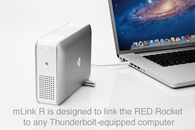 mLogic introduced the mLink R specifically designed to enable RED Rocket workflows on portable computers with Thunderbolt connectivity such as the MacBook Pro. mLink R features a small and sleek chassis tailored to the RED Rocket card and provides two Thunderbolt ports for daisy-chaining of up to six high-speed Thunderbolt peripherals.