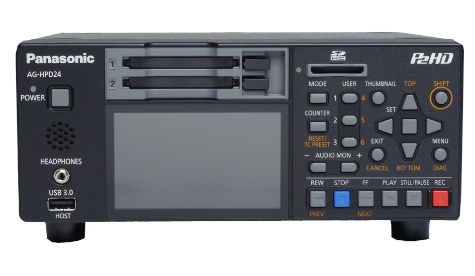 Panasonic’s new solid-state AG-HPD24 P2 half rack deck has powerful features including 3D synchronized record/playback; native 24P recording with variable frame rates; a super-fast USB 3.0 interface; and 24-bit, four-channel audio recording in AVC-Intra 100/50. Featuring AVC-Intra 100/50 record/playback, the HPD24 makes 10-bit, 4:2:2 master-quality video affordable and portable.