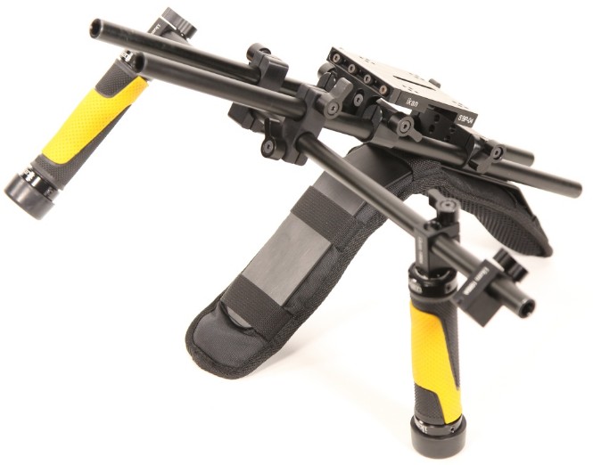 padded shoulder brace, lightweight and sturdy, designed to place the camera as close to your body’s pivot point as possible (above the shoulder) to reduce rolling shutter on video takes.