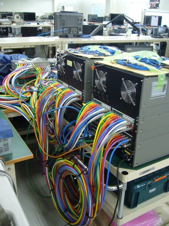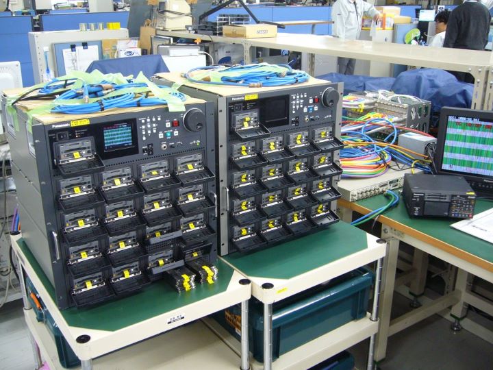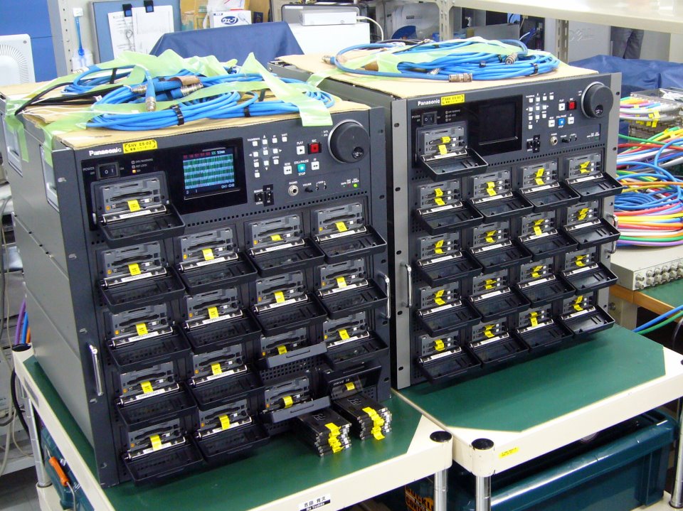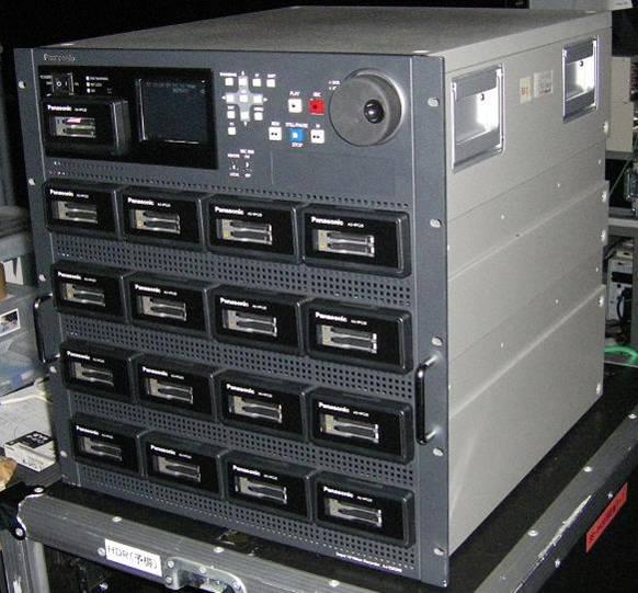 The London 2012 Olympics will have some events broadcast to live outdoor public screens around the world in Super Hi-Vision or SHV and we covered the logistics and details here. But how do you go about recording NHK’s 7,680 x 4,320 Super Hi-Vision signal? With a monster Panasonic P2 tower or 2 or more, that is how. Check out the slots on that baby and the P2 cards ready to go. Not to mention the colourful cabling going on.