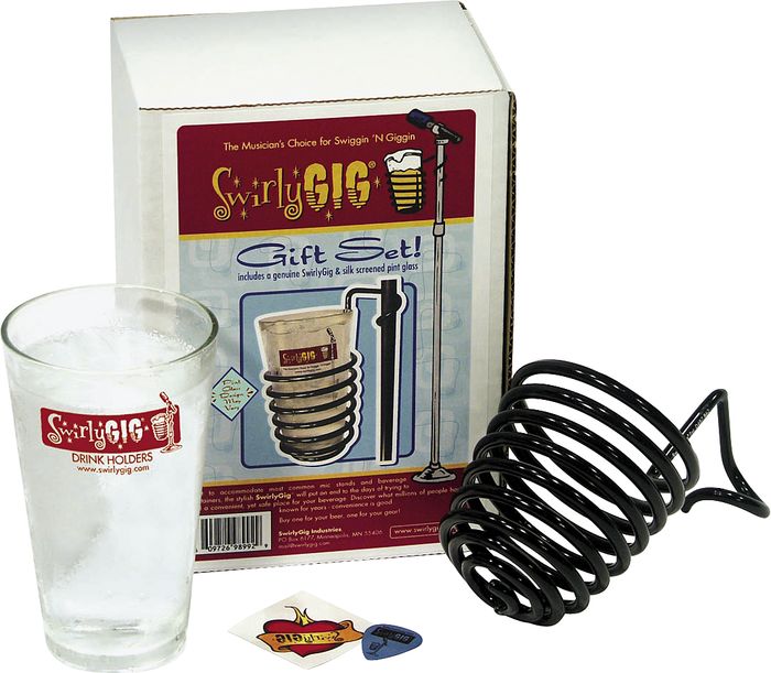 SwirlyGig is built to fit on roughly half-inch tubing. Try it on light stands, mic stands, music stands, drum hardware, etc. The SwirlyGig will hold cans, bottles, glasses as well as odds and ends!