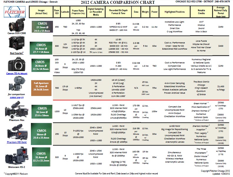 Fletcher Camera & Lenses are well known for sales and rental of cine camera gear to big and small productions and now they have released their updated camera comparison chart for 2012. The Fletcher Camera Comparison Chart covers all the important things you need to know about large medium and compact cine cameras like Sensor Sizes, Base ISO, Frame Rates, Recorded Bit Depth, Weight, Power, and Highlighted Positives + many more handy features you may need to take a quick look at on a handy chart.