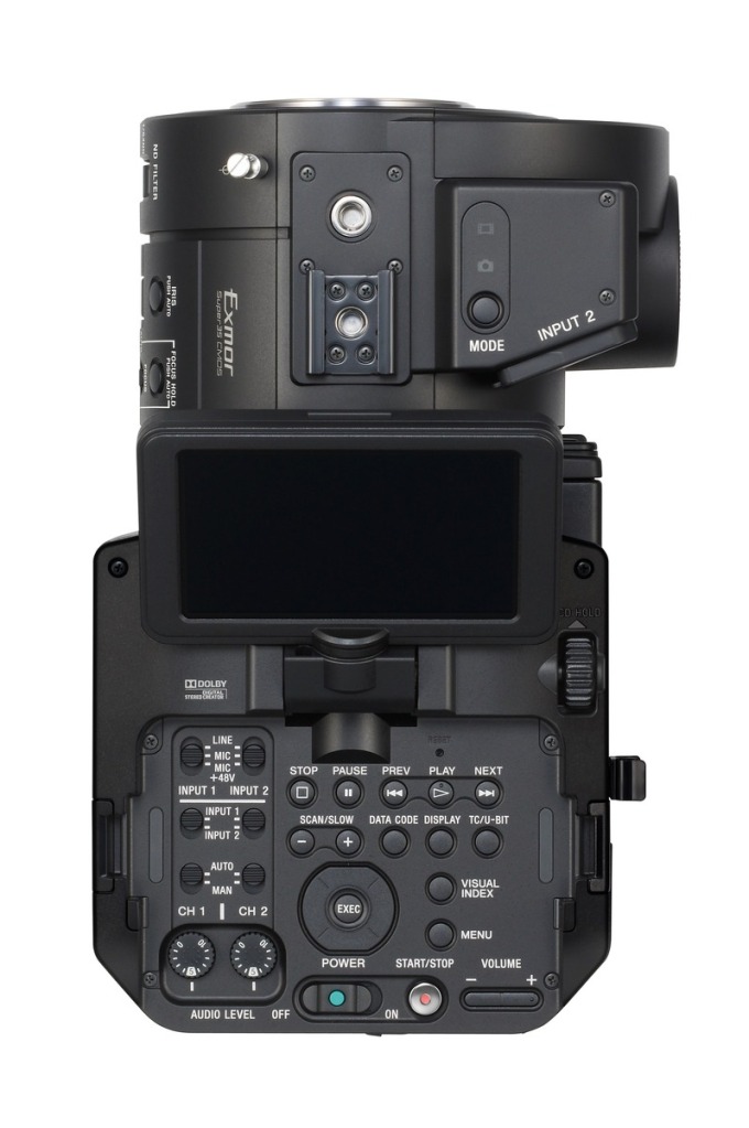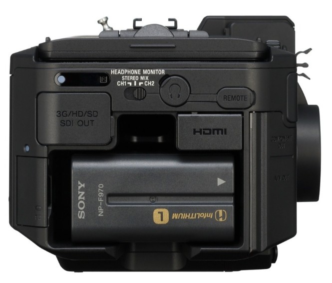 The Sony FS700 has built on the modular form of the FS100 and has an improved removable handle on the top. At the back of the FS700 camera the second XLR input has moved positions to the FS100’s. Focus and auto iris functions are now on the grip. Similar to the Sony PMW-F3 there is a position set aside for a future zoom rocker.