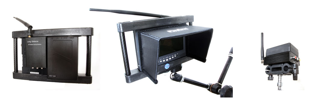 Robert Benson a Pro Snapper from San Diego has a range of wireless monitor solutions that work with DSLR cameras. Coming out this month is a Pro Monitor setup that will have nearly a 1.6 kilometer / 1 mile range transmitting video and audio, with an eight hour battery life and four channels. Price will be about $575.